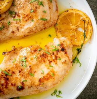 • Pour the olive oil, Renegade Lemonade, chicken stock, lemon zest, sliced garlic cloves, oregano, and salt into a rimmed baking sheet and mix well to combine