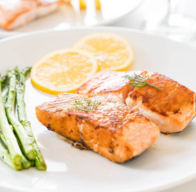 • Carefully place the salmon into the hot pan, skin side down, and turn down the heat to medium-high.